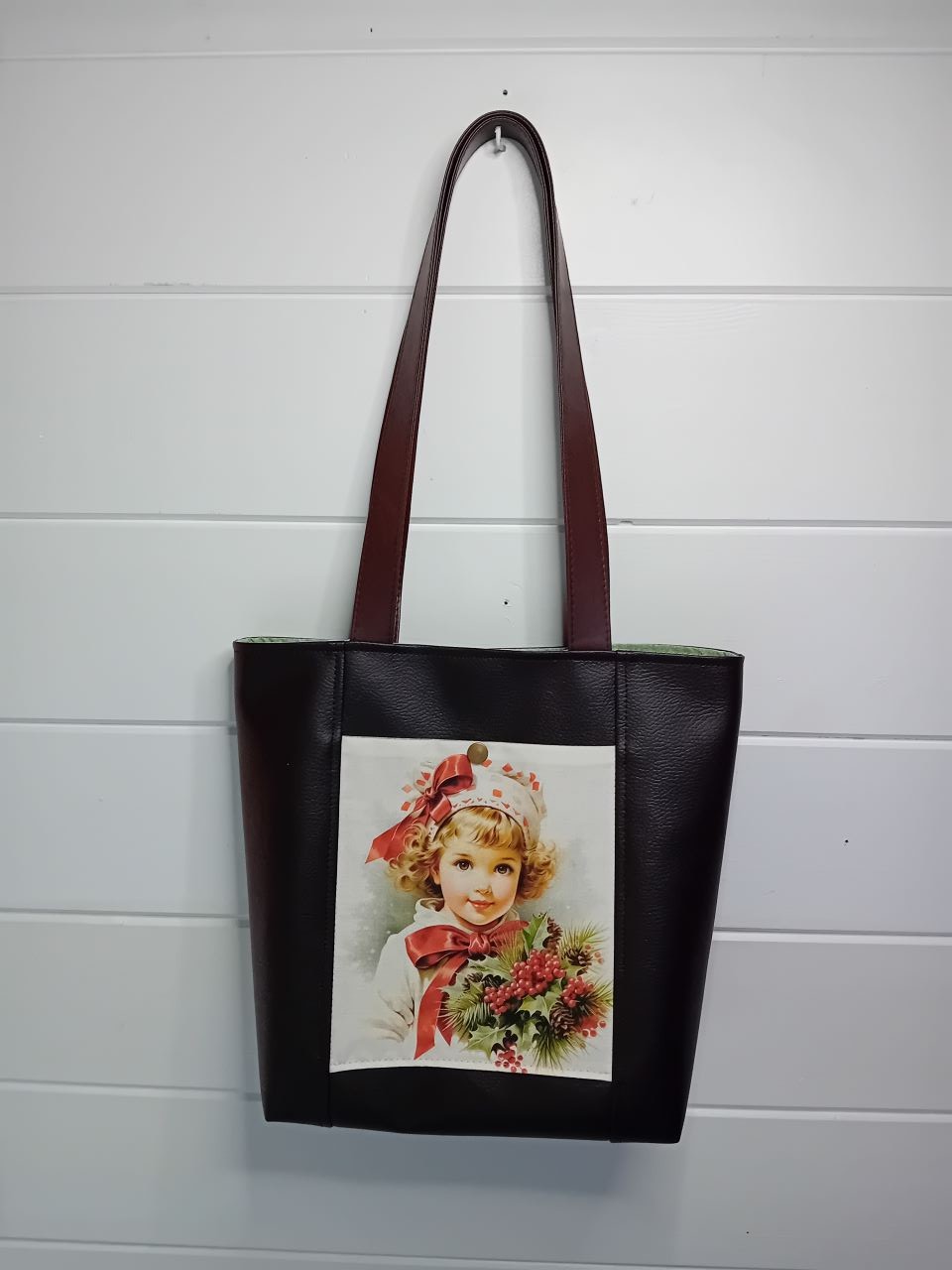 Composition : Deux faces en simili cuir marron chocolat avec une poche en tissu imprimé. Anses en simili cuir marron, assorties aux couleurs du sac. Tissu intérieur vert amande marbré. Fermeture du sac par bouton magnétique.