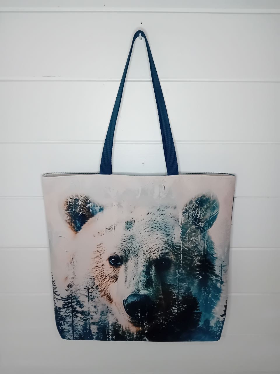 Composition : Une face imprimée en velours. Une face en velours côtelé. Anses en polyester bleu pétrole, assorties aux couleurs du sac. Tissu intérieur uni gris perle. Fermeture du sac par bouton magnétique.