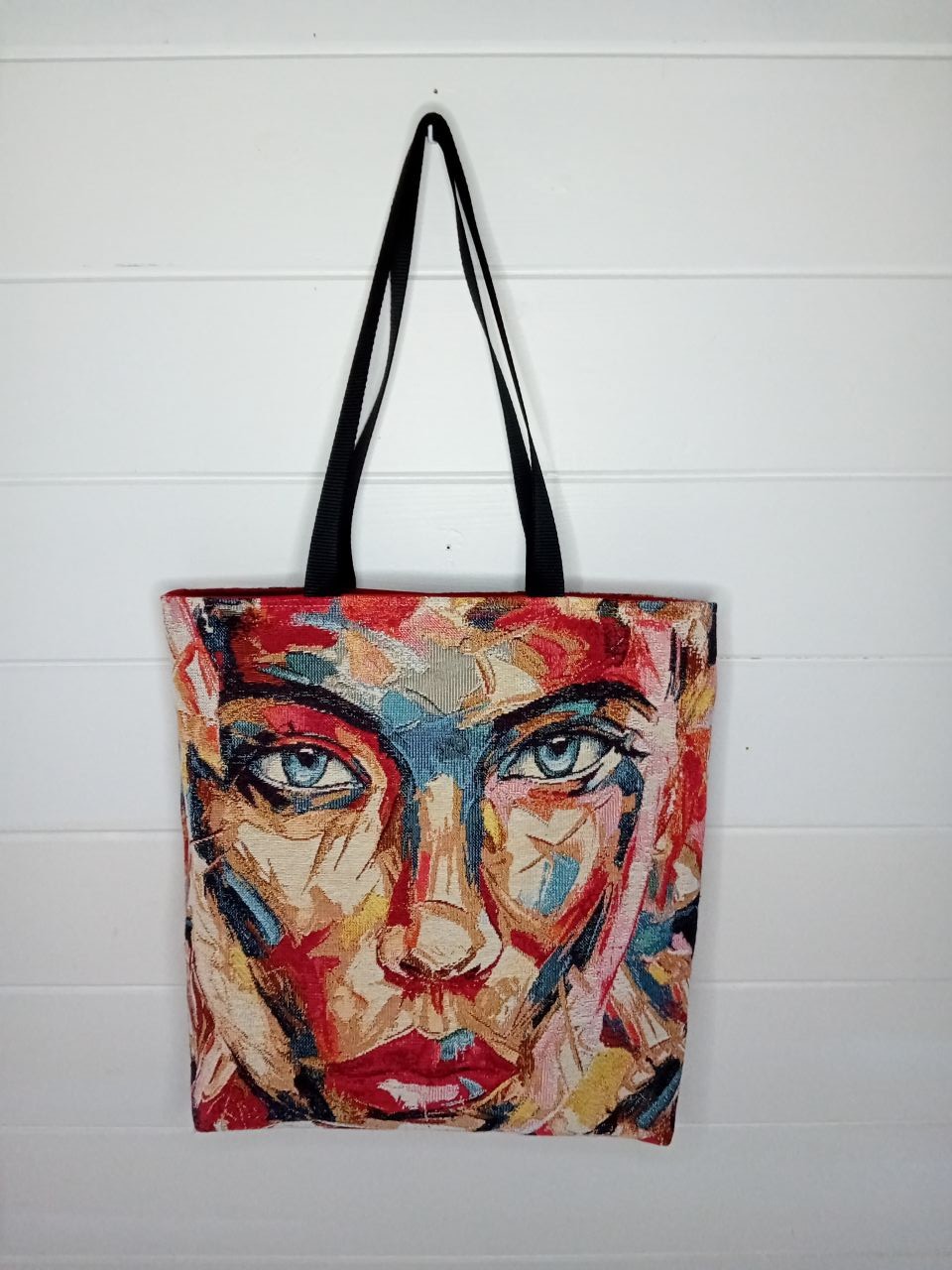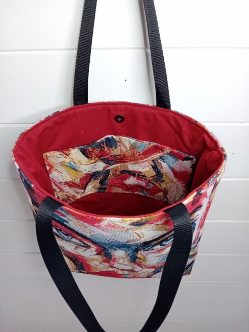 Composition : 2 faces imprimées en toile jacquard. Anses en polyester noir, assorties aux couleurs du sac. Tissu intérieur uni. Fermeture du sac par bouton magnétique. Poche intérieure.