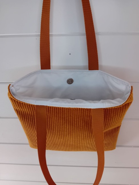 Composition : Une face imprimée en canvas. Une face en velours côtelé. Anses en polyester, assorties aux couleurs du sac. Tissu intérieur uni. Fermeture du sac par bouton magnétique.
