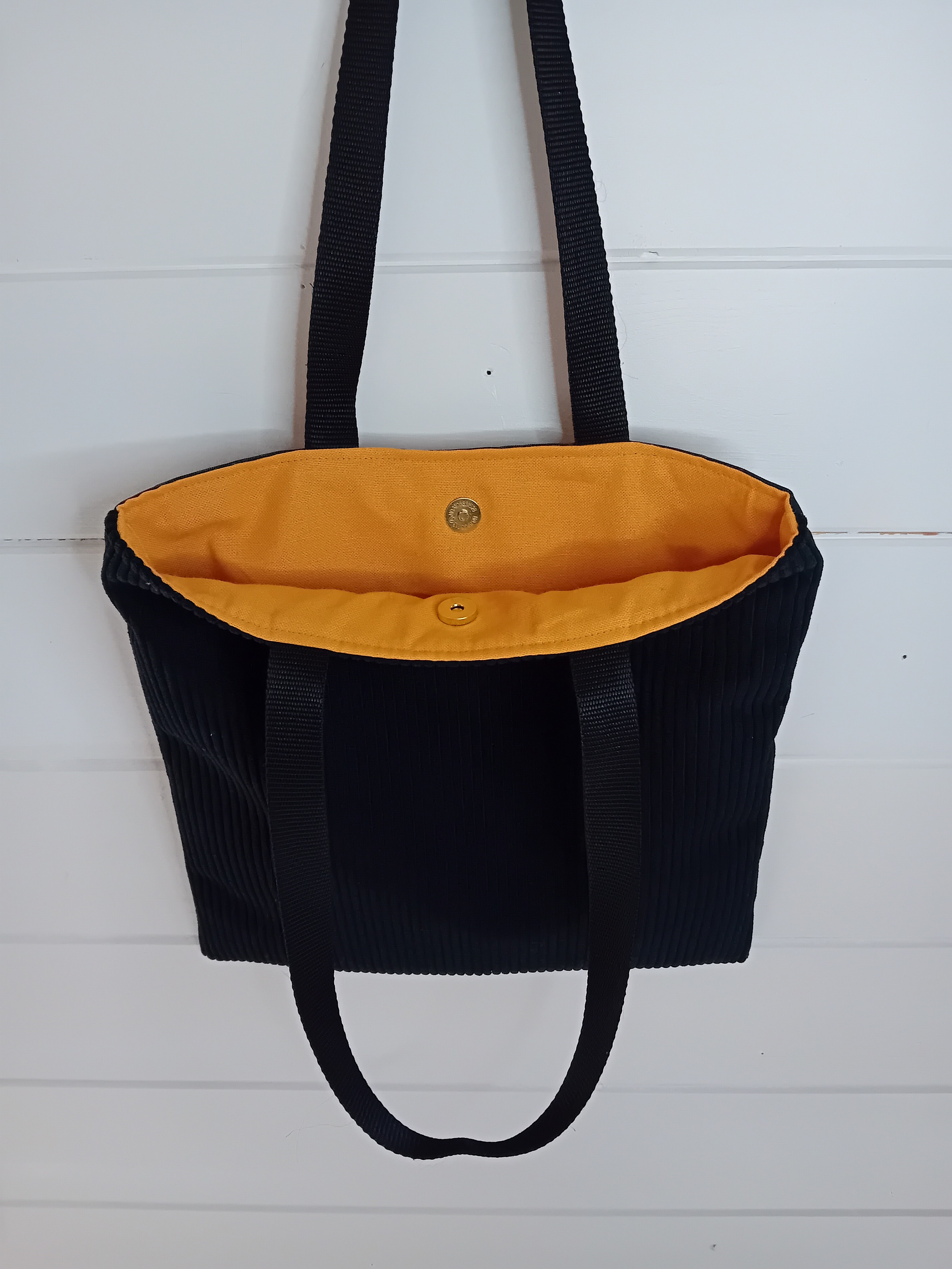 Composition : Une face imprimée en toile canva (100% polyester). Une face en velours côtelé noir (polyester majoritaire). Anses en polyester noir, assorties aux couleurs du sac. Tissu intérieur en 100% coton uni jaune. Fermeture du sac par bouton magnétique.