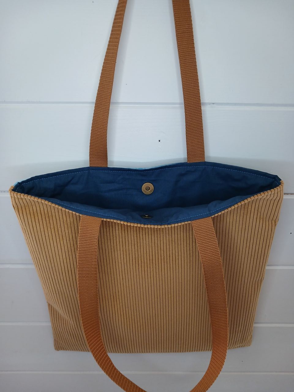 Composition : Une face imprimée en toile polyester imperméable (100% polyester). Une face en velours côtelé sable (polyester majoritaire). Anses en polyester, assorties aux couleurs du sac. Tissu intérieur en 100% coton uni bleu. Fermeture du sac par bouton magnétique.