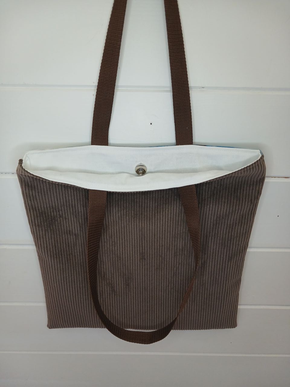 Composition : Une face imprimée en toile polyester imperméable (100% polyester). Une face en velours côtelé taupe (polyester majoritaire). Anses en polyester, assorties aux couleurs du sac. Tissu intérieur en 100% coton uni blanc. Fermeture du sac par bouton magnétique.